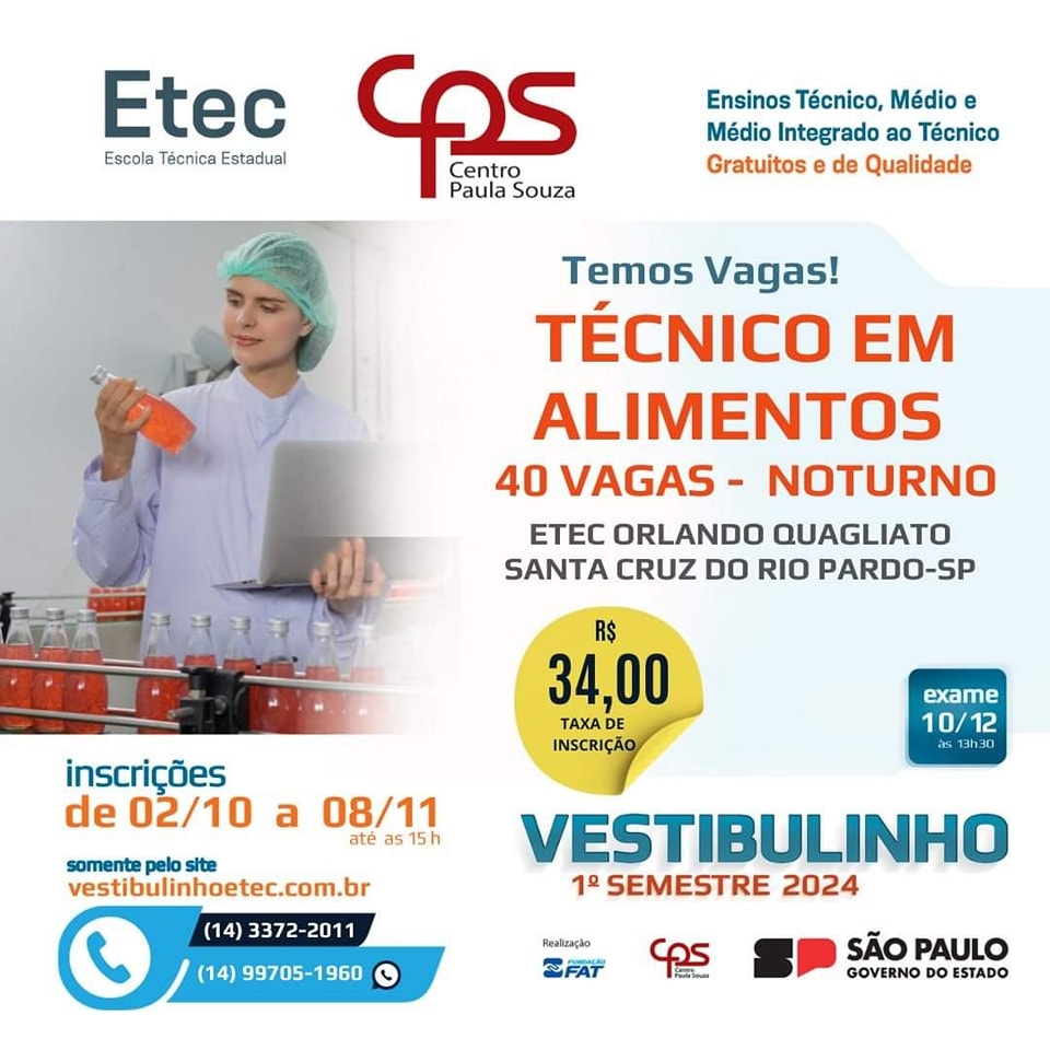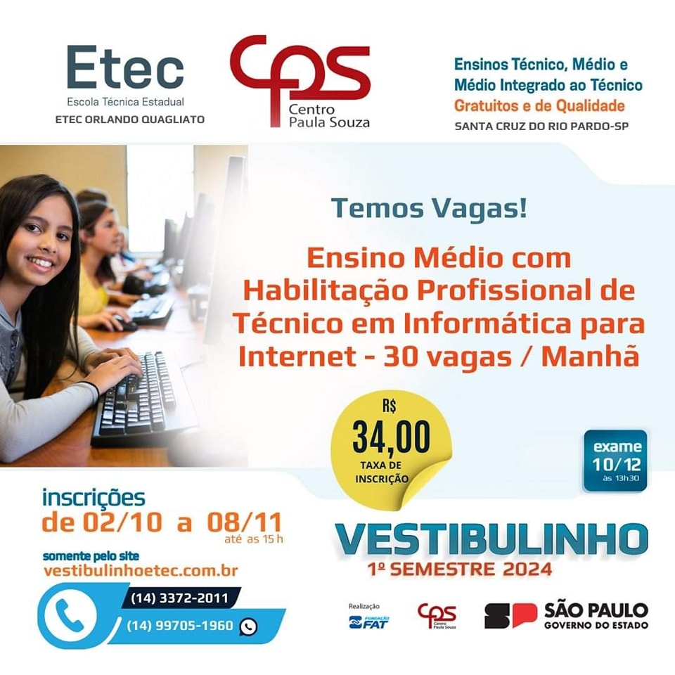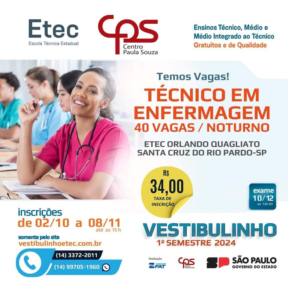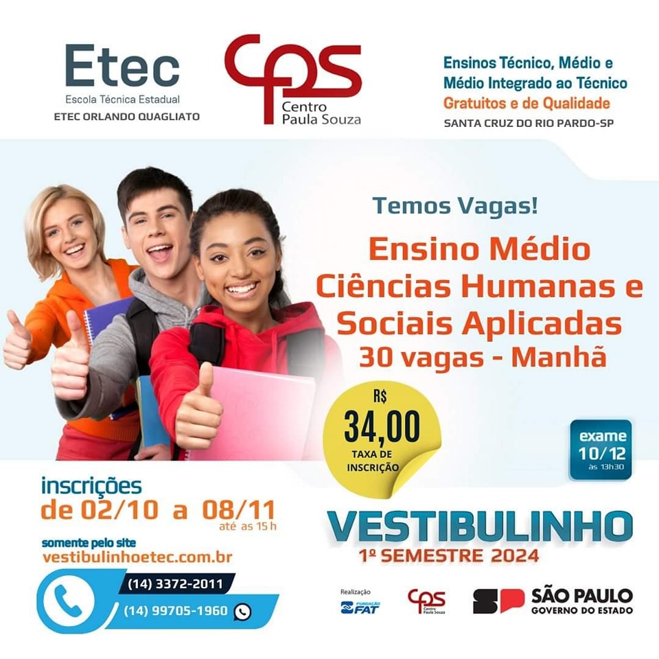 Estão abertas as inscrições para o vestibulinho Etec para o primeiro semestre de 2024. São 230 vagas em Santa Cruz do Rio Pardo para cursos técnicos e ensino médio. Os interessados devem se inscrever entre os dias 02 de outubro e 08 de novembro pelo site www.vestibulinhoetec.com.br. As provas estão agendadas para o dia 10 de dezembro. As vagas são para Técnico em Alimentos, Técnico em Enfermagem, Ciências Humanas e Sociais Aplicadas (ensino médio), Habilitação Profissional para Técnico de Informática (ensino médio) e Ensino Médio Integrado ao Técnico em Agropecuária. Informações pelo 3372-2011.